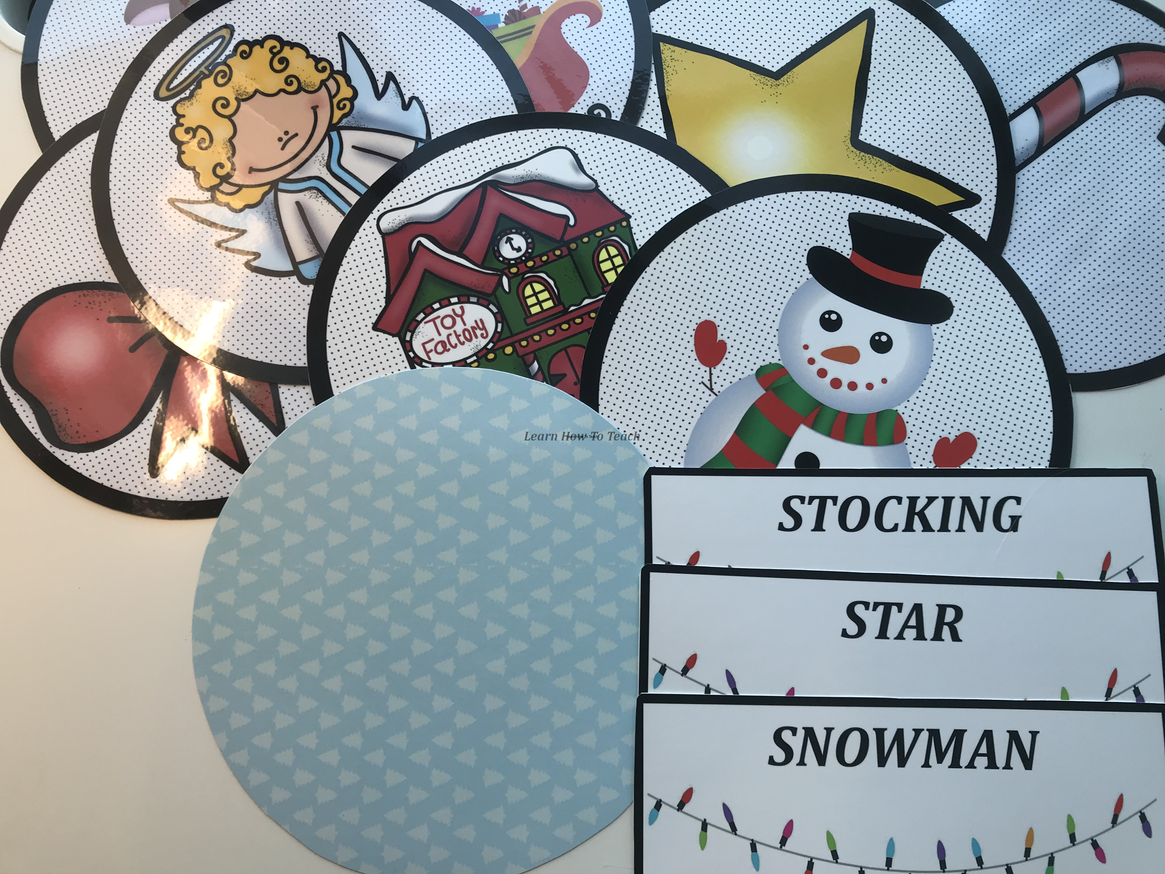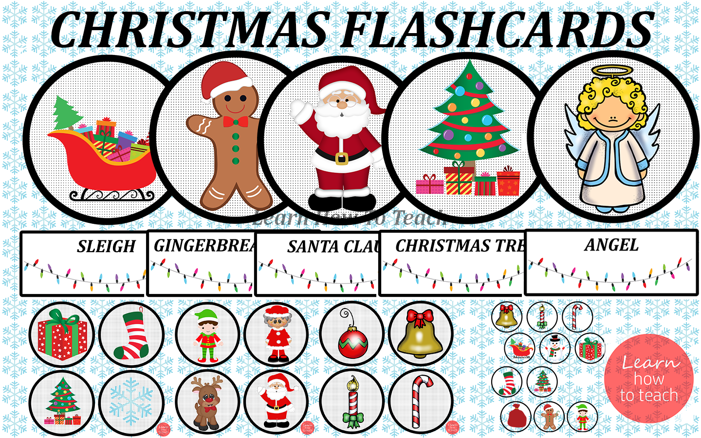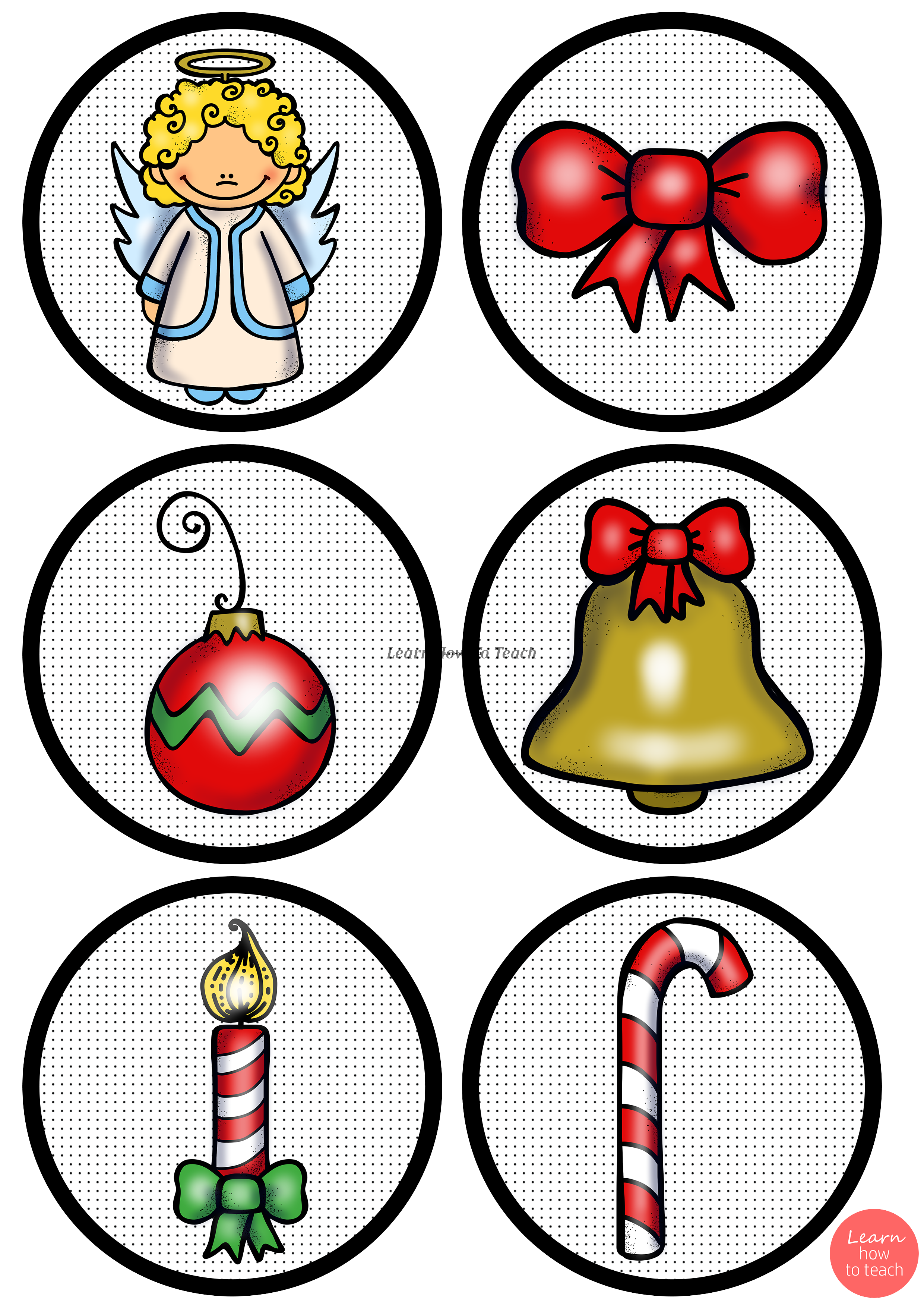 W zestawie znajduje się 3x24 flashcards w postaci kół w trzech rozmiarach (duże koła około 19cm, średnie koła około 9cm i małe koła około 5 cm średnicy) o tematyce świątecznej.