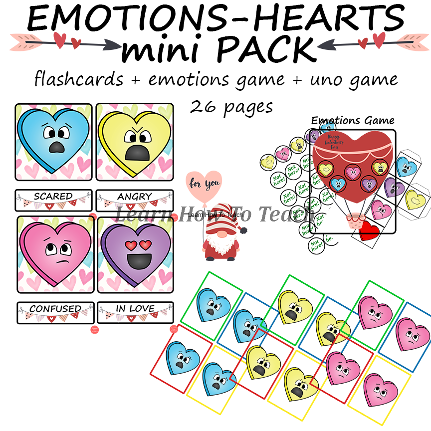*11 stron dużych flashcards Emotions- Hearts ilustrujących słownictwo: sad, surprised, cool, in love, angry, confused, scared, happy, shy, excited, silly