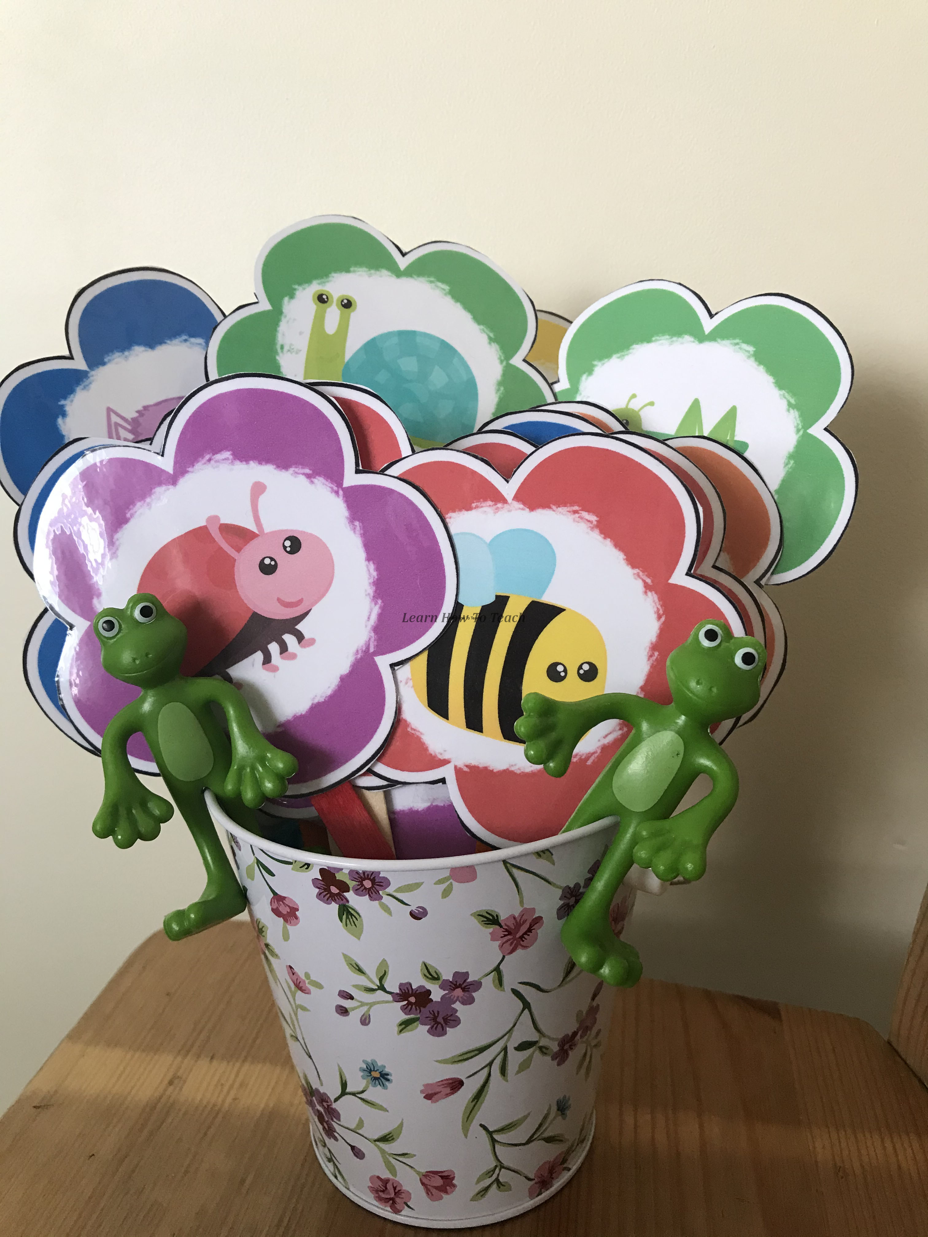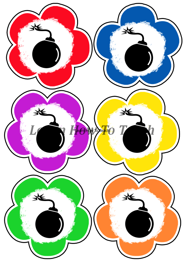 Należy przykleić kwiatki na drewniane patyczki i umieścić je w pudełku lub wiaderku tak ,by wystawały tylko patyczki. Dzieci losują kolejno kwiatki i nazywają co się na nich znajduje, jeżeli nazwą przedmiot poprawnie zdobywają kwiatek- punkt. Jeżeli podczas losowania trafią na bombę muszą oddać wszystkie swoje punkty. Gracze sami decydują, czy chcą losować dalej czy kończą ruch i zatrzymują kwiatki, które zdobyli. Wygrywa osoba z największą ilością kwiatów. W grę możemy grać indywidualnie lub w podziale na grupy. Bomby i utracone kwiaty mogą wracać do pudełka, wtedy gra będzie dłuższa, lub mogą być odkładane na bok. Możemy też wyznaczyć czas na grę, np.5 minut, i po tym czasie zliczyć punkty każdego gracza lub każdej grupy.