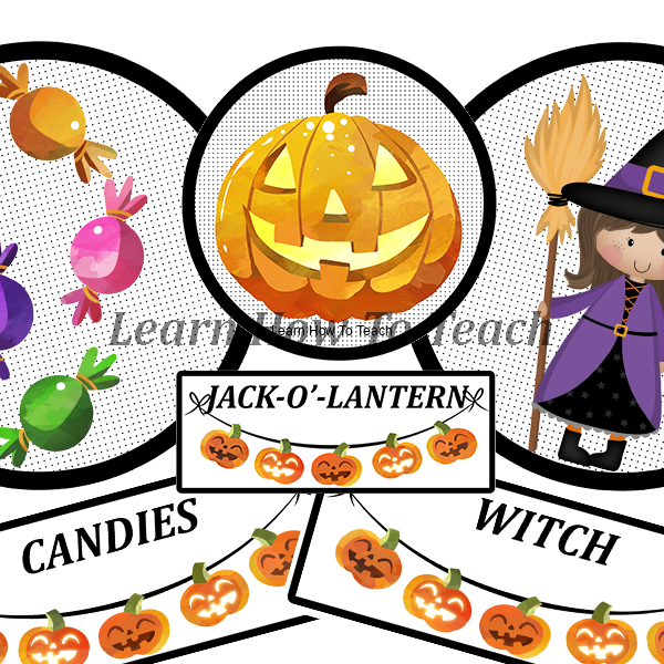 Zakres słownictwa: bat, broom, candies, cat, pot, frankenstein, ghost, jack-o'-lantern, mummy, pumpkin, spider's web, spider, witch, hat, candy corn.