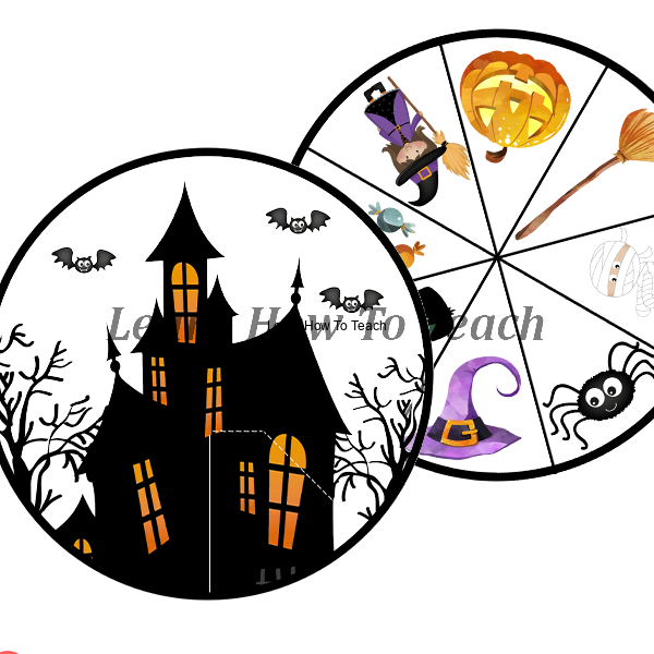 - Spinner Halloween - 2 strony A4 ( spinner składa się z dwóch kół, które należy wyciąć, nałożyć jedno na drugie, połączyć i przeciąć w miejscu drzwi, tak jak wskazuje przerywana linia. W ten sposób otwierając drzwi będą nam się pokazywać różne obrazki).