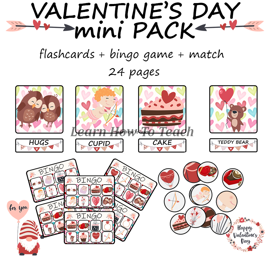 *14 stron dużych flashcards Valentine's Day ilustrujących słownictwo: hugs, balloon, bow, cake, chocolates, cupid, flowers, heart, kisses, love letter, gift, ring, teddy bear, cupcake
